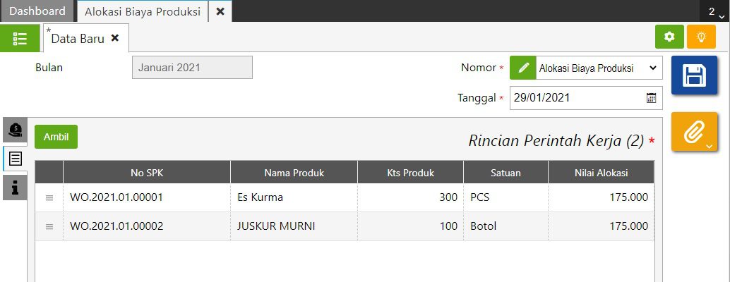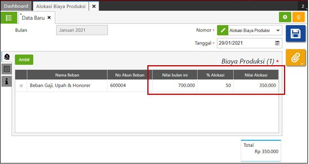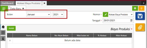 - Bulan: untuk memilih bulan dan tahun alokasi biaya produksi.