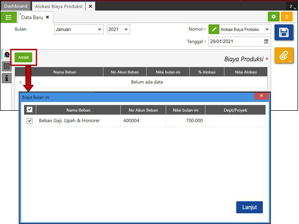 4. Selanjutnya klik Ambil dan pilih biaya produksi yang dimaksud (catatan: nilai biaya akan muncul jika digunakan dalam proses produksi di periode tanggal alokasi biaya tersebut). Lalu klik Lanjut.