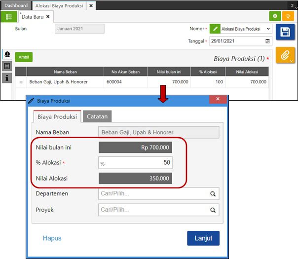 Kamu bisa menggunakan fitur ini untuk mengalokasikan biaya-biaya yang dikeluarkan dalam proses produksi ke dalam harga pokok produksi atas produk tersebut. Proses alokasi biaya ke harga pokok produksi, baru dapat dilakukan setelah kamu melakukan pencatatan pengeluaran atas biaya tersebut.