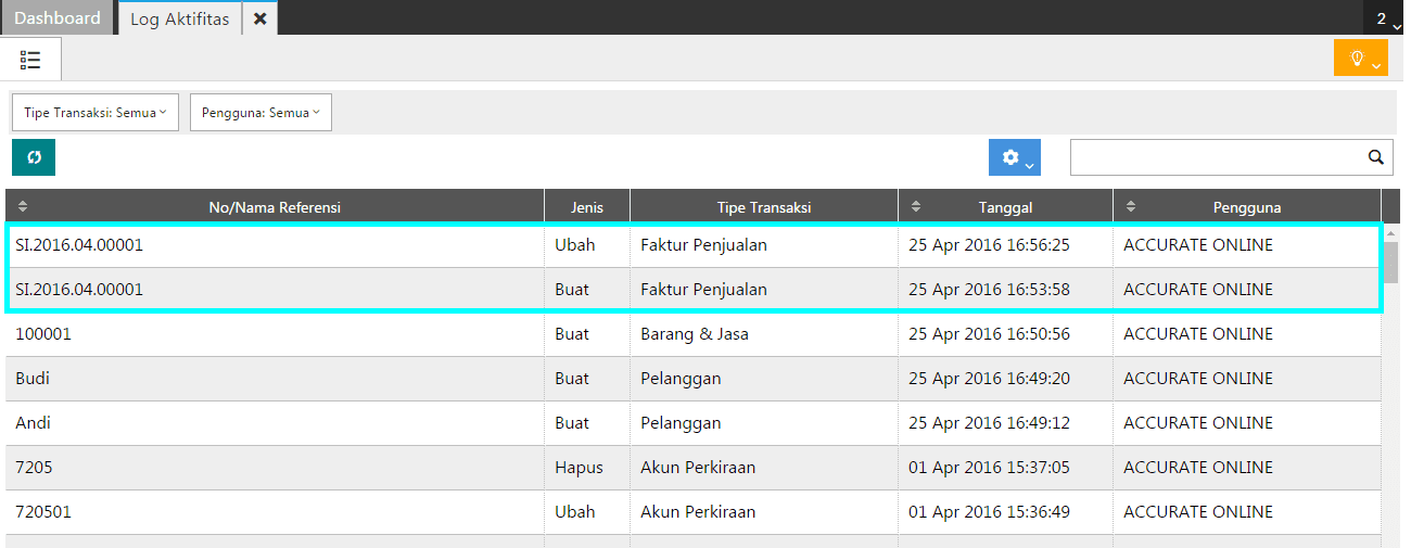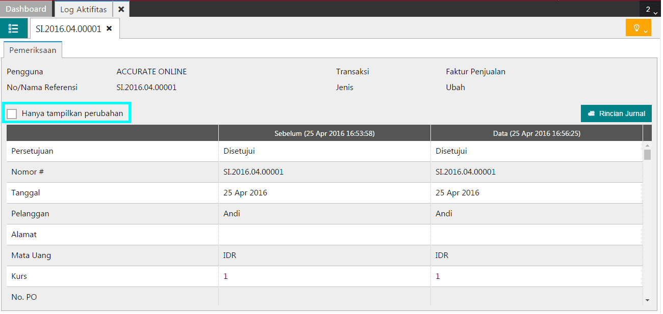3. Contoh gambar di atas menunjukan terdapat transaksi penjualan dengan nomor SI.2016.04.00001, transaksi tersebut status awalnya ‘Dibuat‘, kemudian ‘Diubah‘ oleh pengguna dengan nama Accurate Online.