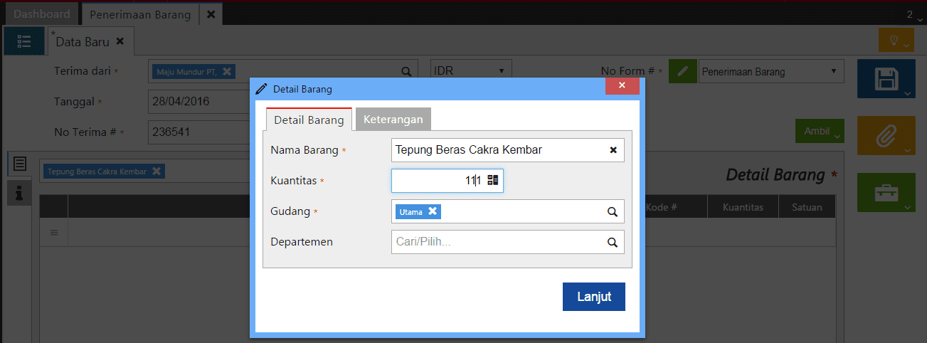 3. Lalu lengkapi informasi detail barang yang akan diterima, kemudian klik Lanjut.