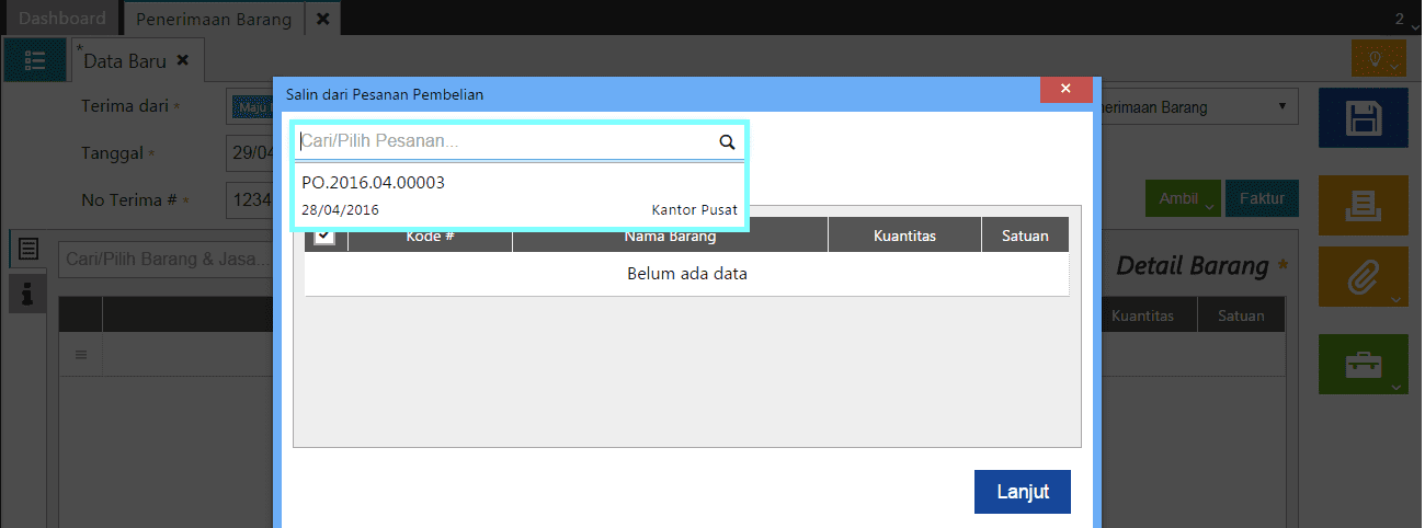 3. Pilih Pesanan Pembelian yang akan dimasukan kedalam Penerimaan Barang, lalu klik Lanjut.
