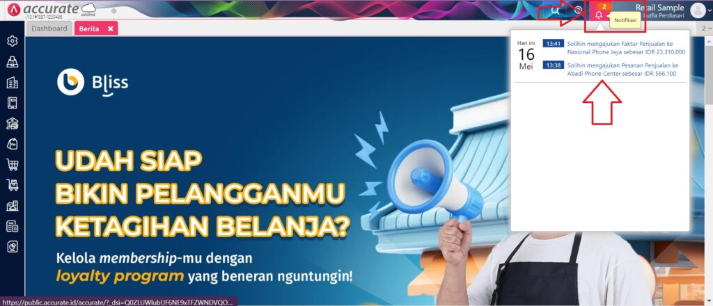3. Selanjutnya pada pengguna yang sudah diberikan hak akses untuk menyetujui transaksi akan muncul notifikasi persetujuan pada halaman database Accurate Online. Notifikasi ini juga dikirim ke email pengguna tetrsebut.