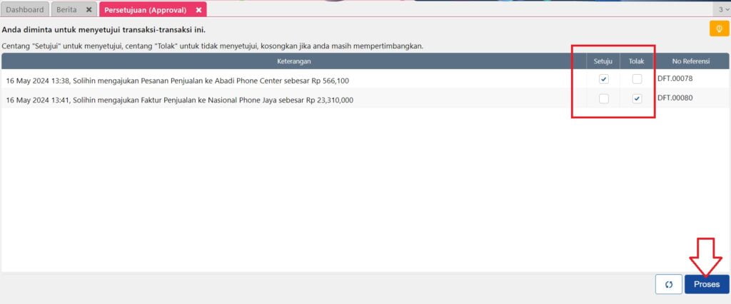 4. Pengguna yang sudah kamu berikan hak akses untuk menyetujui transaksi dapat melakukan persetujuan melalui fitur persetujuan di dalam modul perusahaan. Ceklis pada kolom ‘Setuju‘ jika transaksi disetujui atau ceklis kolom ‘Tolak‘ jika transaksi tersebut ditolak, kemudian klik ‘Proses‘.
