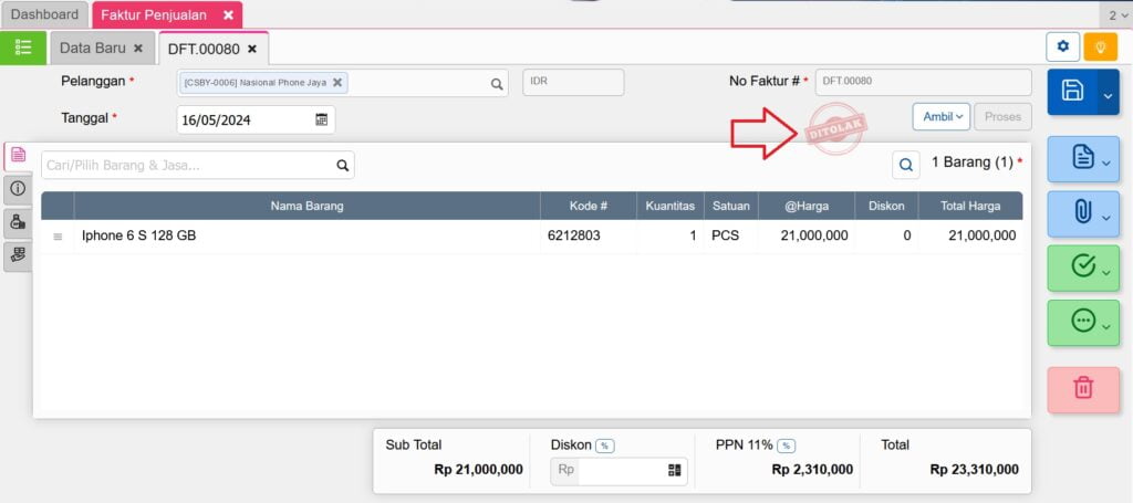 6. Transaksi yang kamu tolak akan muncul dengan status ‘Ditolak‘ pada transaksi tersebut. Kamu dapat menghapusnya atau melakukan pengubahan sesuai dengan kebutuhan.