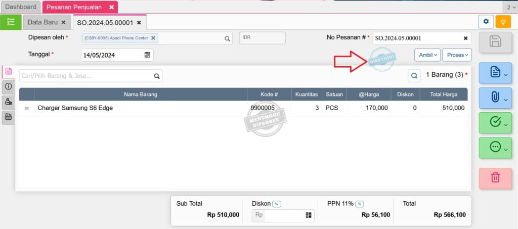 7. Sedangkan transaksi yang sudah disetujui akan otomatis tersimpan sebagai transaksi di Accurate Online dan terdapat infirmasi ‘Disetujui‘ pada formulir transaksi tersebut.