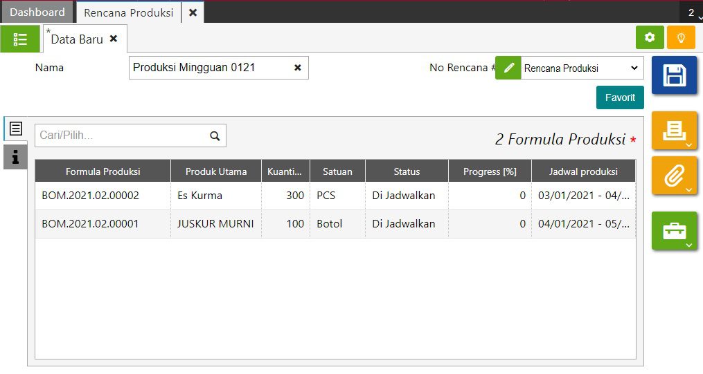 - Favorit: untuk menampilkan dan memilih rencana produksi yang sudah disimpan sebagai favorit.