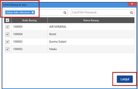 3. Kemudian klik Ambil dan pilih Daftar Barang & Jasa, jika kamu ingin mengisi nilai standar biaya produksi satu per satu, dan akan tampil box pengambilan nama barang berdasarkan Kategori Barang dan Pemasok.