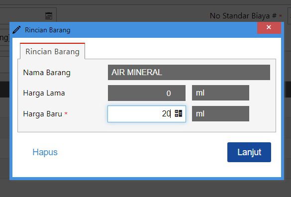 9. Untuk mengisi nilai standar biaya produksinya, klik satu per satu pada nama barangnya hingga muncul box Rincian Barang untuk mengisi nilai Harga Baru. Lakukan pada semua baris barang/biaya produksi hinggal selesai kemudian Simpan.