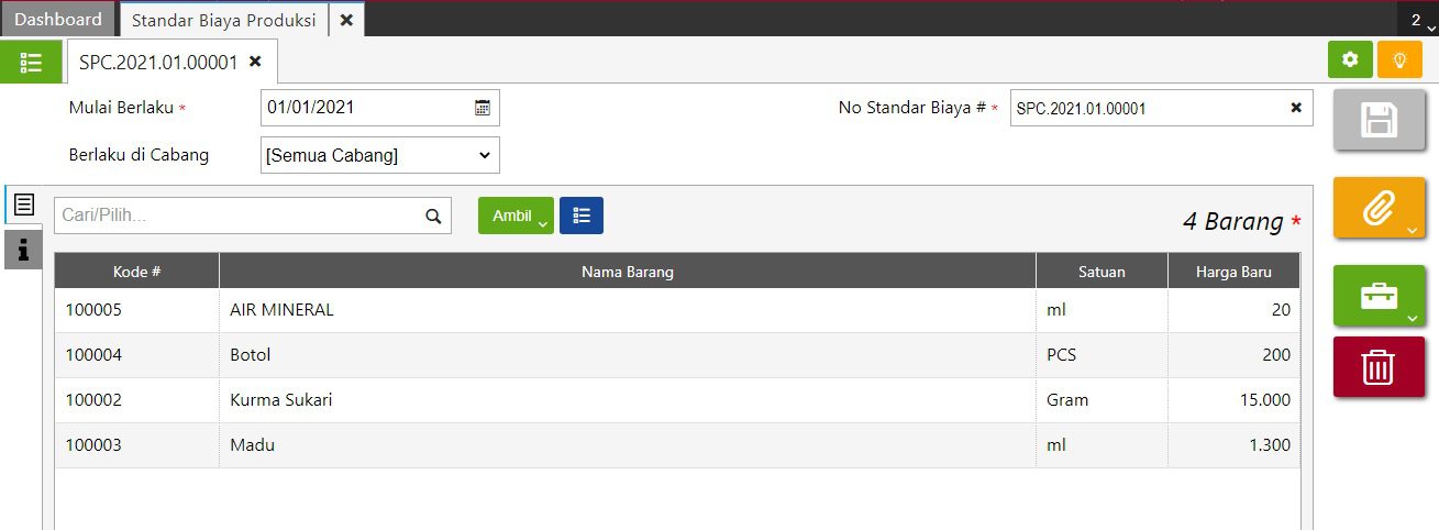 - Berlaku di Cabang: penentuan cabang diberlakukannya nilai standar biaya produksi. Setiap cabang bisa ditentukan berbeda-beda untuk nilai standar biaya produksinya.