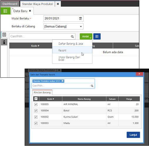 7. Jika kamu ingin membuat standar biaya produksi dari transaksi favorit yang sudah disumpan sebelumnya, klik pilihan Favorit dan cari nomor favorit yang dimaksud kemudian klik Lanjut. Selanjutnya isi nilai standar biaya produksi yang baru, klik Simpan jika sudah selesai.