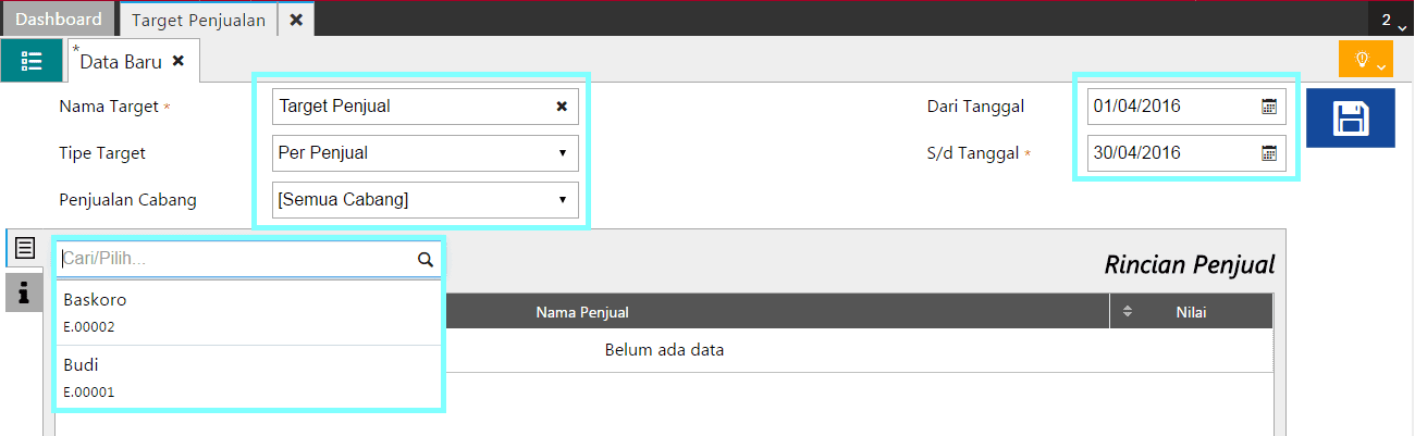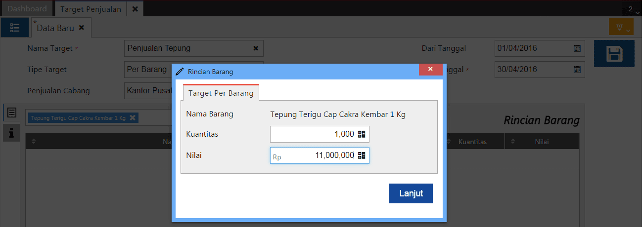 - Penjualan Cabang: menentukan nama cabang dimana target yang dibuat ini berlaku.
